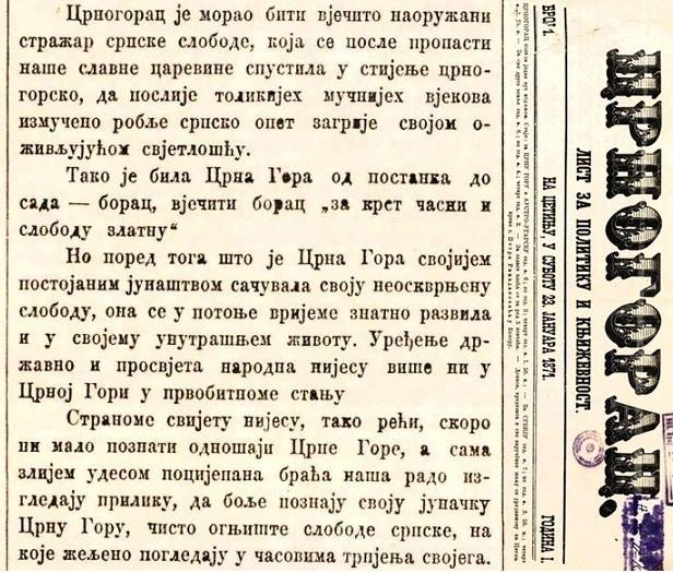 23.јануара 1871 године на Цетињу је почео да излази први лист у Црној Гори под називом ЦРНОГОРАЦ. Након двије године он ће почети да излази под именом ГЛАС ЦРНОГОРЦА Ово је одломак из првог броја листа ЦРНОГОРАЦ у којем је описан циљ излажења овог листа..