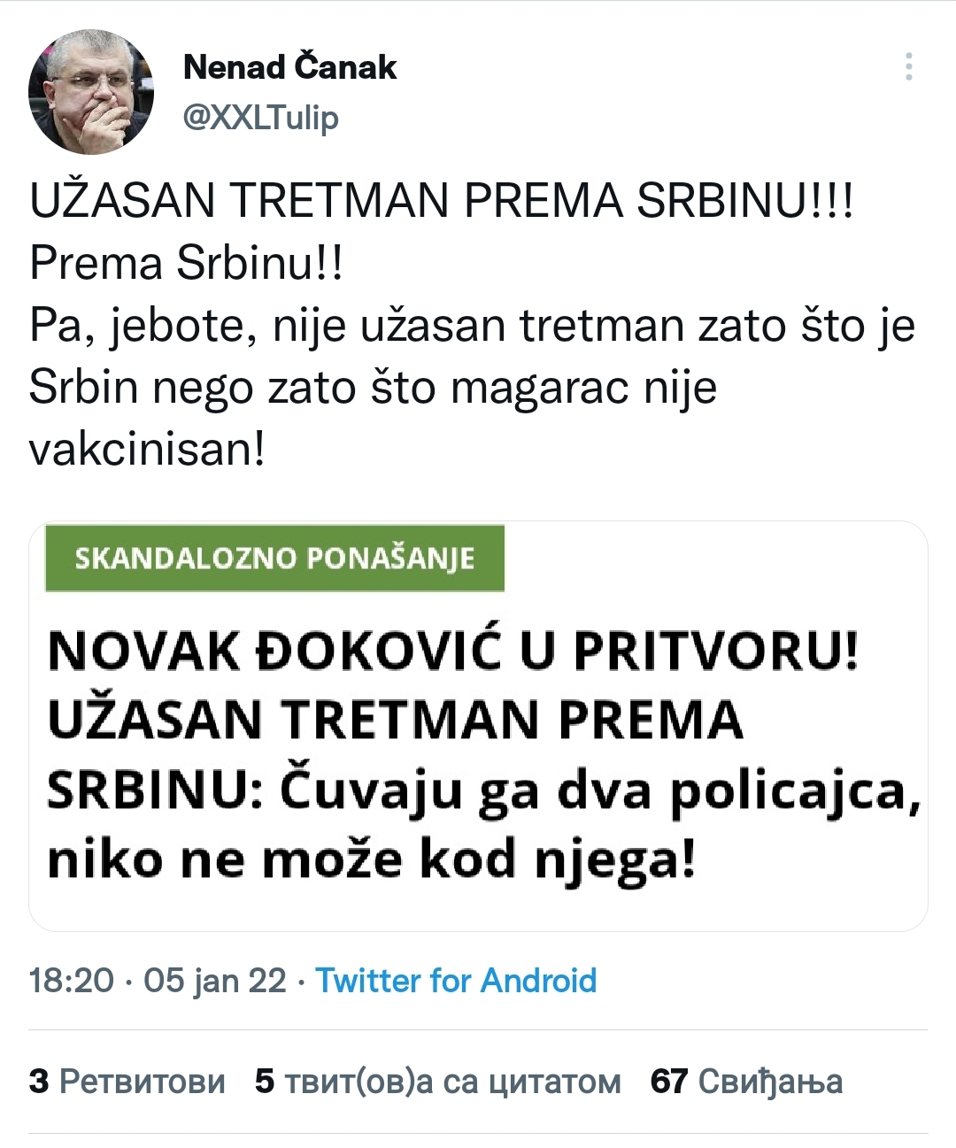 Па, је*оте, није ужасан третман зато што је Србин него зато што магарац није вакцинисан!“.