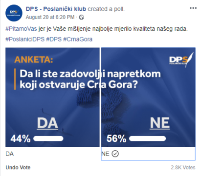 Пажњу нашег портала привукла је анкета на страници: „Да ли сте задовољни напретком који остварује Црна Гора?“
