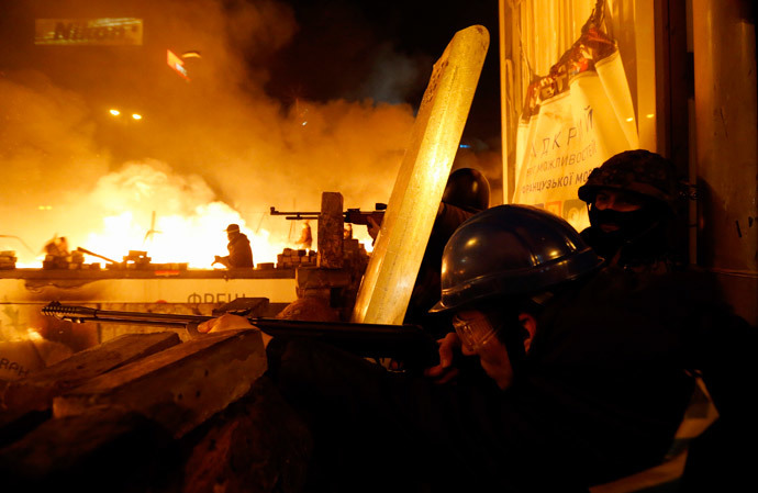 У овом тренутку (иза четири сата, по нашем времену), стање на кијевским улицама се само погоршава. Прави рат између полиције и демонстраната никако да утихне. Демонстранти су направили камп, на централном Тргу Независности, и уз помоћ запаљених гума, штитова и лима , направили су барикада. На полицијски покушај растеривања сузавцем, демонстранти су одговорили молотовљевим коктелима, али и бојевом муницијом. Биланс вечерашњих нереда је 20 људи за сада ( 11 демонстраната и 9 полицајаца). За жртве из редова полицијских снага се сматра да су погинули од прострелних рана, што потврђује претпоставке да је дио демонстраната наоружан ватреним оружијем.