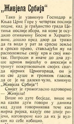 ,,Живјела Србија“, тако је узвикнуо Господар и књаз Црне Горе у четвртак послије подне, кад је грађанство града Цетиња послије збора, на коме је осудило отимачину Босне и Херцеговине, дошло пред двор да тражи да га воду у рат за српске земље и српско право, стављајући му на расположење своју крв и свој иметак, пренио је атмосферу са великог митинга испред Зетског дома на Цетињу, лист ,,Цетињски вјесник“ 1908. године.