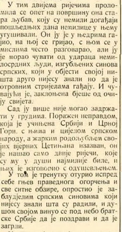 – Поражен неправдом, која је учињена Србији и Црној Гори, с њима и цијелом српском народу, а ажарким родољубљем својих вјерних Цетињана изазван, он је нашао само двије ријечи које су му у души најмилије биле и њих је изговорио с одушевљењем, писало је у чланку.