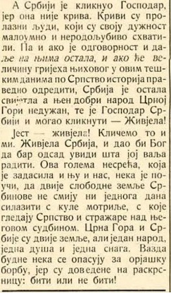 Лист нагласио је да је Србија остала свијетла и недужна, као и Црна Гора, те да је господар морао ускликнути те ријечи, а потом исказао наду да ће несрећа која је задесила српски народ послужити као наук српским земљама – да не смију нити једног дана престати да мотре и бране српством.