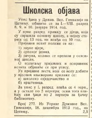У децембру 1913. године, у ,,Гласу Црногорца“ штампана је школска објава управе Цетињске гимназије којом се најављује упис нових ђака и наглашава да је обавезно полагање пријемног испита и то из предмета српски језик и вјеронаука.