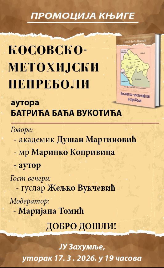 Представљање књиге „Косовско-метохијски непреболи“ аутора Батрића Бата Вукотића биће одржано у никшићком Захумљу вечерас, 17. марта са почетком у 19 часова.
