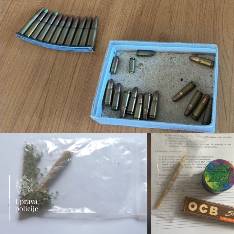 Претресом стана и других просторија које користи В.О. из Берана пронађено је и одузето 26 комада муниције, док је претресом просторија које користи Н.В. из Андријевице полиција пронашла и одузела 28 таблета са листе опијата, стартни пиштољ и 16 комада муниције, ваздушну пушку и муницију за исту.