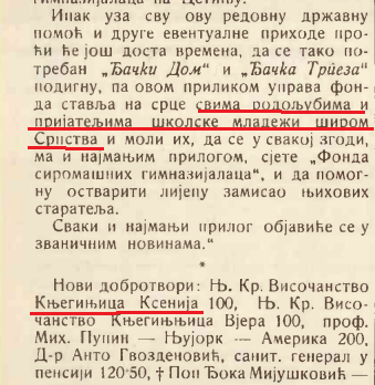 ,,Глас Црногорца“ 21. јануара 1912. објавио је како је лично она финансијски помагала одржавање Светосавских бесједа у Цетињској гимназији.
