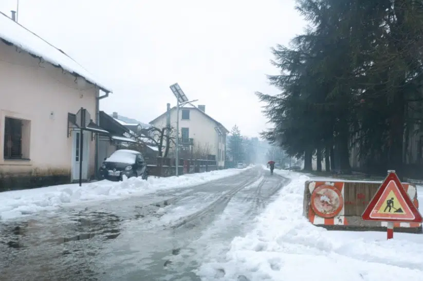 Први снијег на Цетињу, саобраћај отежан због велике воде на коловозима