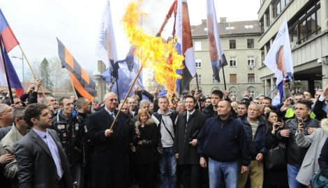 Предсједник Српске радикалне странке Војислав Шешељ запалио је заставу Хрватске испред Палате правде у Београду, гдје треба да буде настављено суђење замјенику предсједника СРС Немањи Шаровићу.