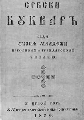 Украшен крстом и ћириличним краснописом, Србски буквар из 1836. године штампан је на Цетињу за вријеме једног од најистакнутнијих Срба свих времена, владара и владике Црне Горе, Петра Другог Петровића Његоша и то је била прва књига из које су малишани поносне његошевске земље стицали знања о свом српском језику и богатој историји српског народа.
