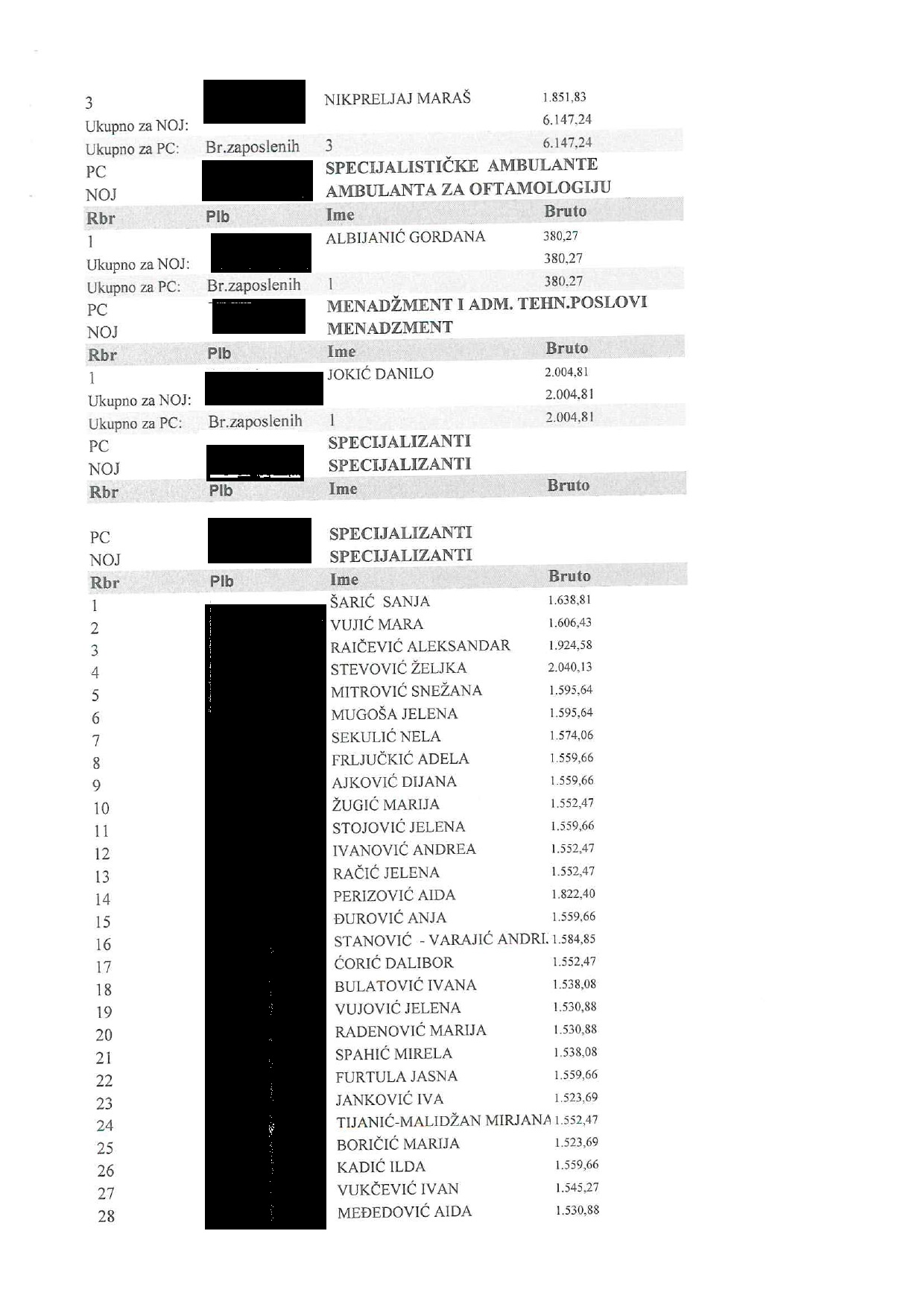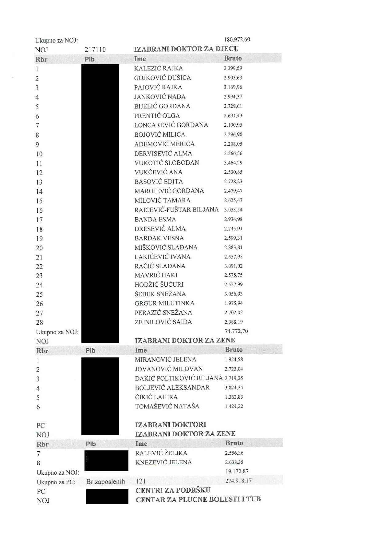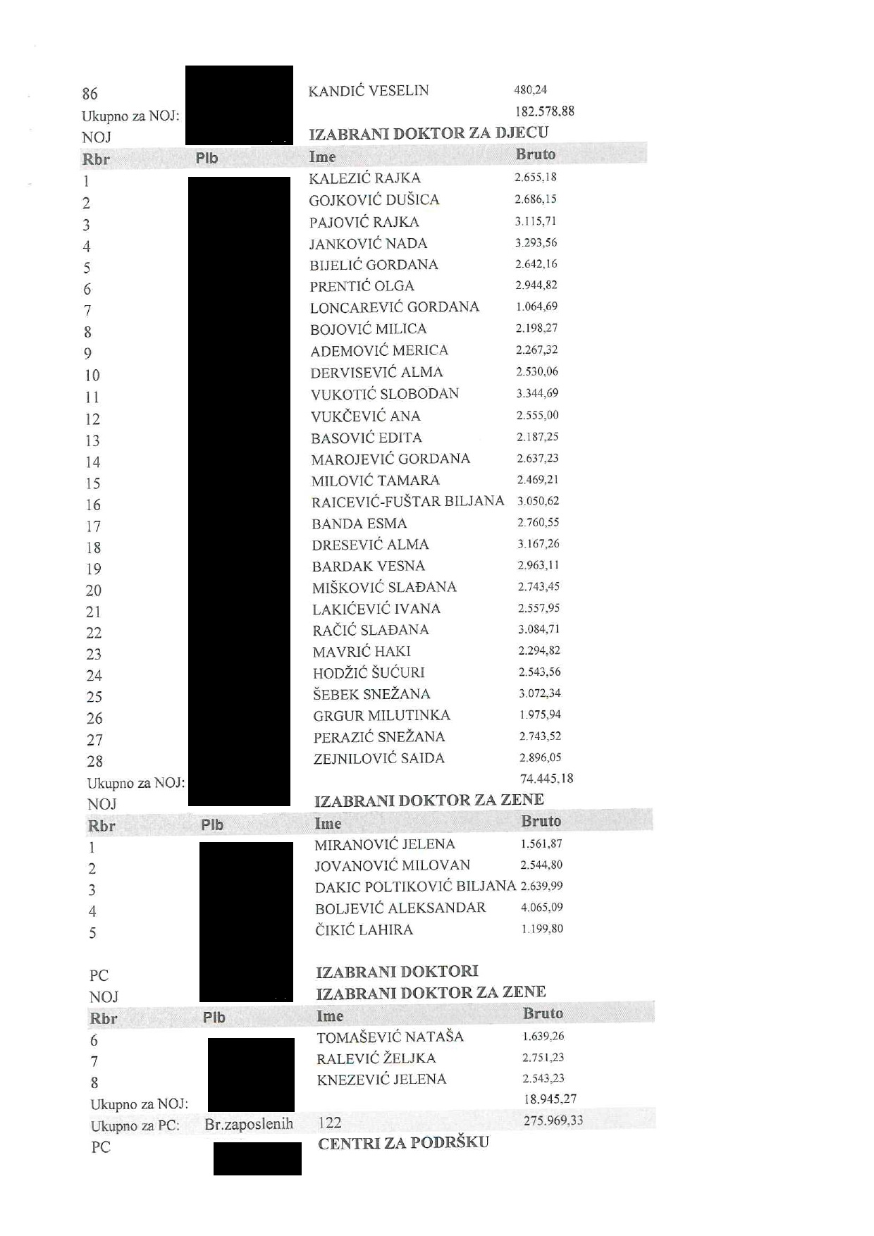 У складу са Законом о слободном приступу информацијама објављујемо табеларни приказ бруто зарада љекара за мјесец октобар у подгоричком Дому здравља: