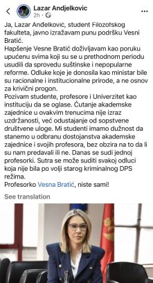 Студент Филозофског факултета Лазар Анђелковић јавно је на Фејсбук профилу изразио пуну подршку бившој министарки просвјете, науке, културе и спорта и универзитетској професорки Весни Братић, оцјењујући њено хапшење као политичку поруку упућену свима који су се усудили да спроводе суштинске и непопуларне реформе.