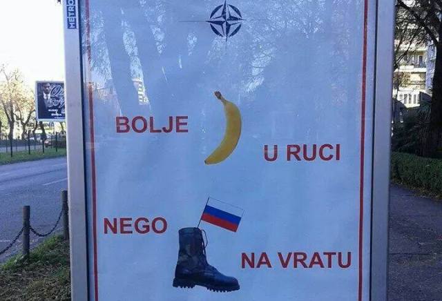 Подсјећамо, „Црногорске патриоте“ су поставиле билборд са логом НАТО-а и поруком „Боље банана у руци, него руска чизма за вратом“.