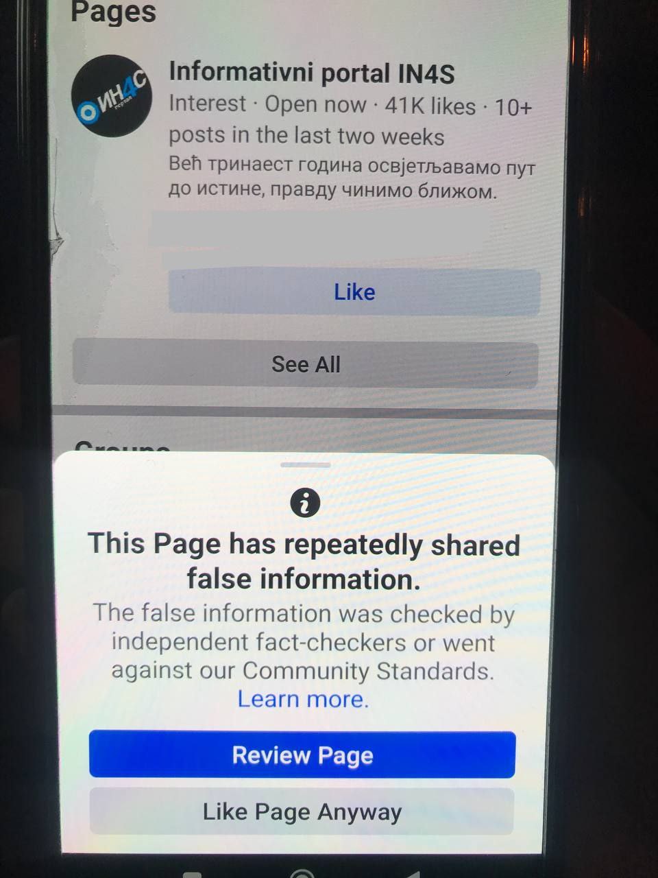У последње време, нови пратиоци не могу да дођу до нас због упозорења које нас обележава као „творце лажних вести“, и које преиспитује Вашу намеру питањем „Да ли сте сигурни да желите да лајкујете страницу која дели лажне вести?“