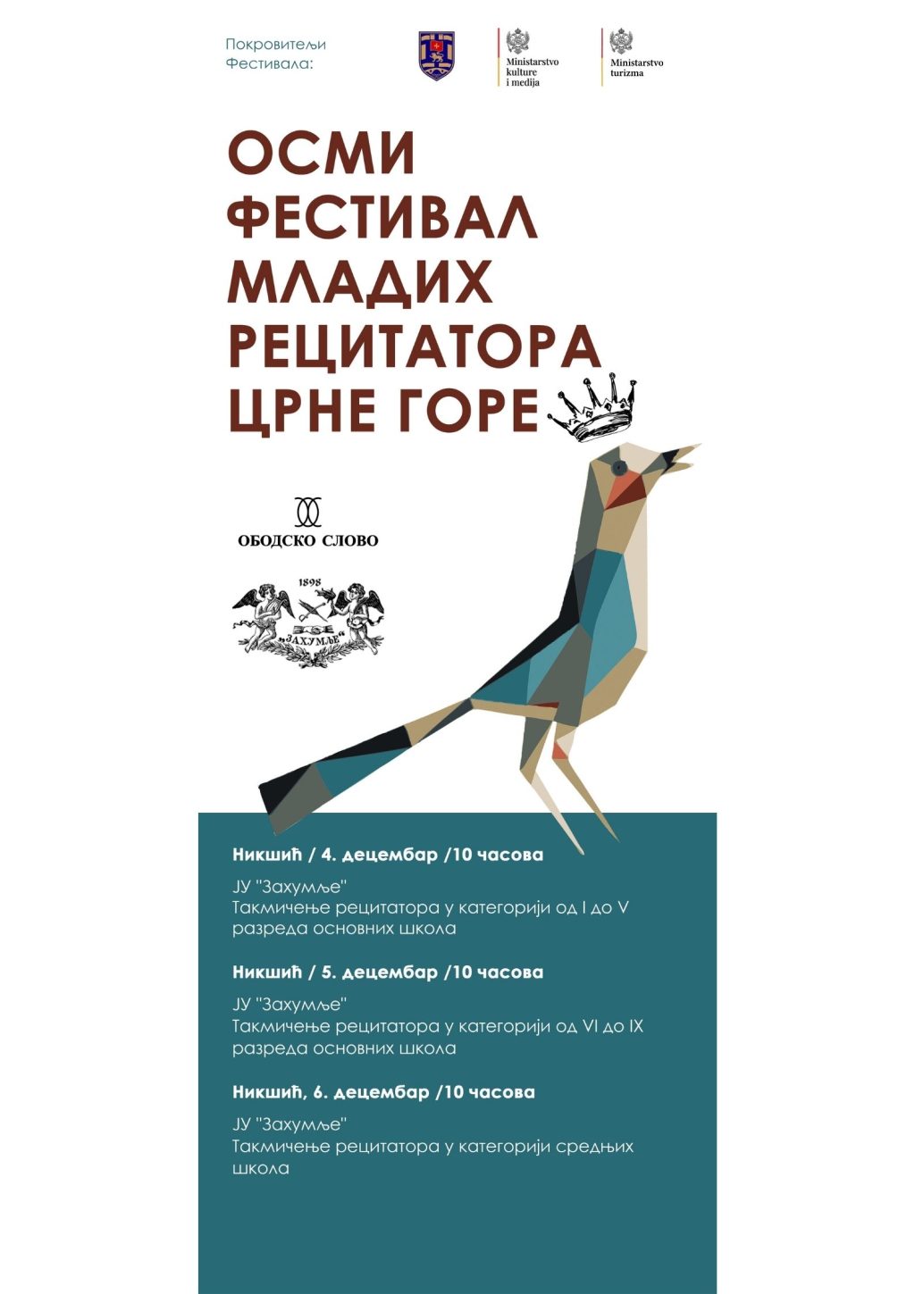 Овогодишњи Фестивал младих рецитатора Црне Горе биће организован у Никшићу, у сали ЈУ “Захумље”, од четвртог до шестог децембра.