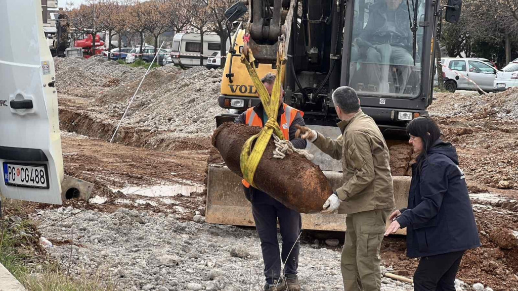 Уклоњена је бомба са градилишта Булевара Вељка Влаховића коју су јутрос током копања канала за канализацију пронашли радници Црнагорапута. Шеф одсјека за неексплодирана убојна средства у Директорату за ванредне ситуације Милован Јоксимовић саопштио је за „Дан“ да је у питању заостала авионска бомба из Другог свјетског рата. Са Јоксимовићем је на терен изашао и Миодраг Бешовић, директор Директората за ванредне ситуације.