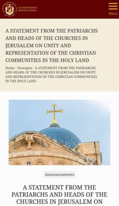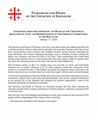 Патријарси и поглавари цркава у Јерусалиму издали су саопштење у којем упозоравају да недавне активности које промовишу идеологију „хришћанског ционизма“ представљају опасност за хришћанско присуство и јединство црквених заједница у Светој земљи. Они истичу да је пастирска и духовна мисија која је вековима поверена апостолским црквама у овом светом региону угрожена када појединци настоје да политички присвоје црквену власт и утичу на јавност.