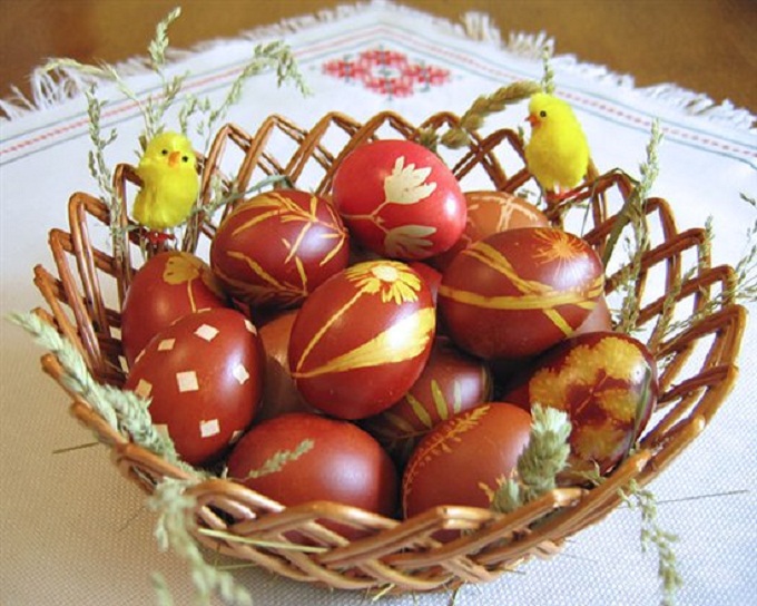 Фарбање природним бојама: Посебно занимљиво и јако декоративно може бити враћање фарбању јаја домаћим састојцима. Тако на примјер за црвенкасто-браон боју користите љуску црног лука, за блиједо жуту цвјетове камилице, за љубичасту боровницу, за наранџасту нарендану шаргарепу, за зелену коприву и спанаћ… Направите вреле растворе жељених боја и сем воћа или поврћа ставите и кашику сирћета. Ставите јаја у ове растворе и држите их до добијања жељене боје (може и преко ноћи).