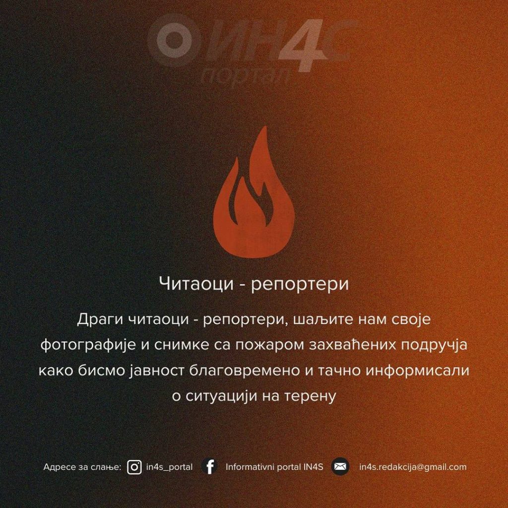 ИН4С позива све читаоце да нам доставе фотографије и видео снимке са локација захваћених пожарима широм Црне Горе. Ваши материјали ће нам помоћи да јавност благовремено и што тачније обавјештавамо о стању на различитим мјестима, те да заједно створимо што потпунију слику ситуације на терену.