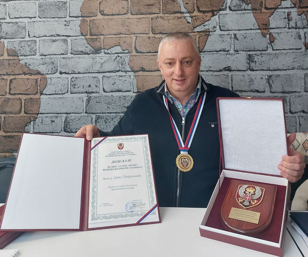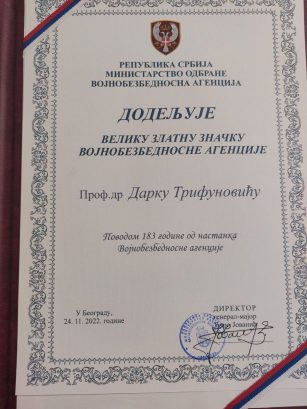 Дарку Трифуновићу, самозваном експерту за безбједност, који често коментарише друштвено-политичке прилике у Црној Гори, региону и свијету, Војно-безбједносна агенција Србије је додијелила златну значку поводом 183 године њеног постојања.