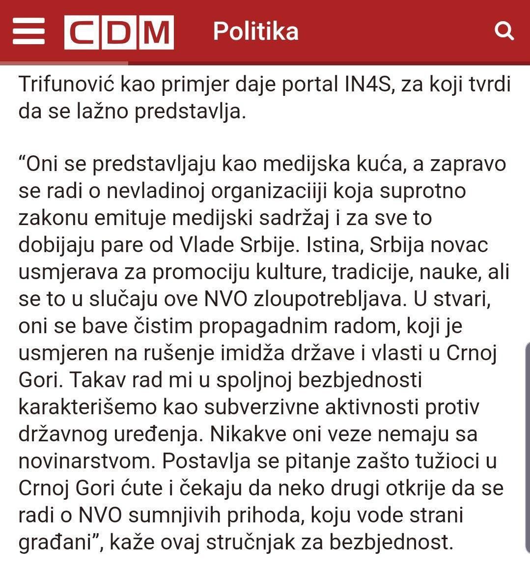 Досадила је Трифуновићева прича о умијешаности Русије у дешавања у Црној Гори и на Балкану, њеном наводном хибридном дјеловању, улози медија под руским утицајем у које редовно сврстава и портал Ин4С, утицају СПЦ и многим другим питањима.