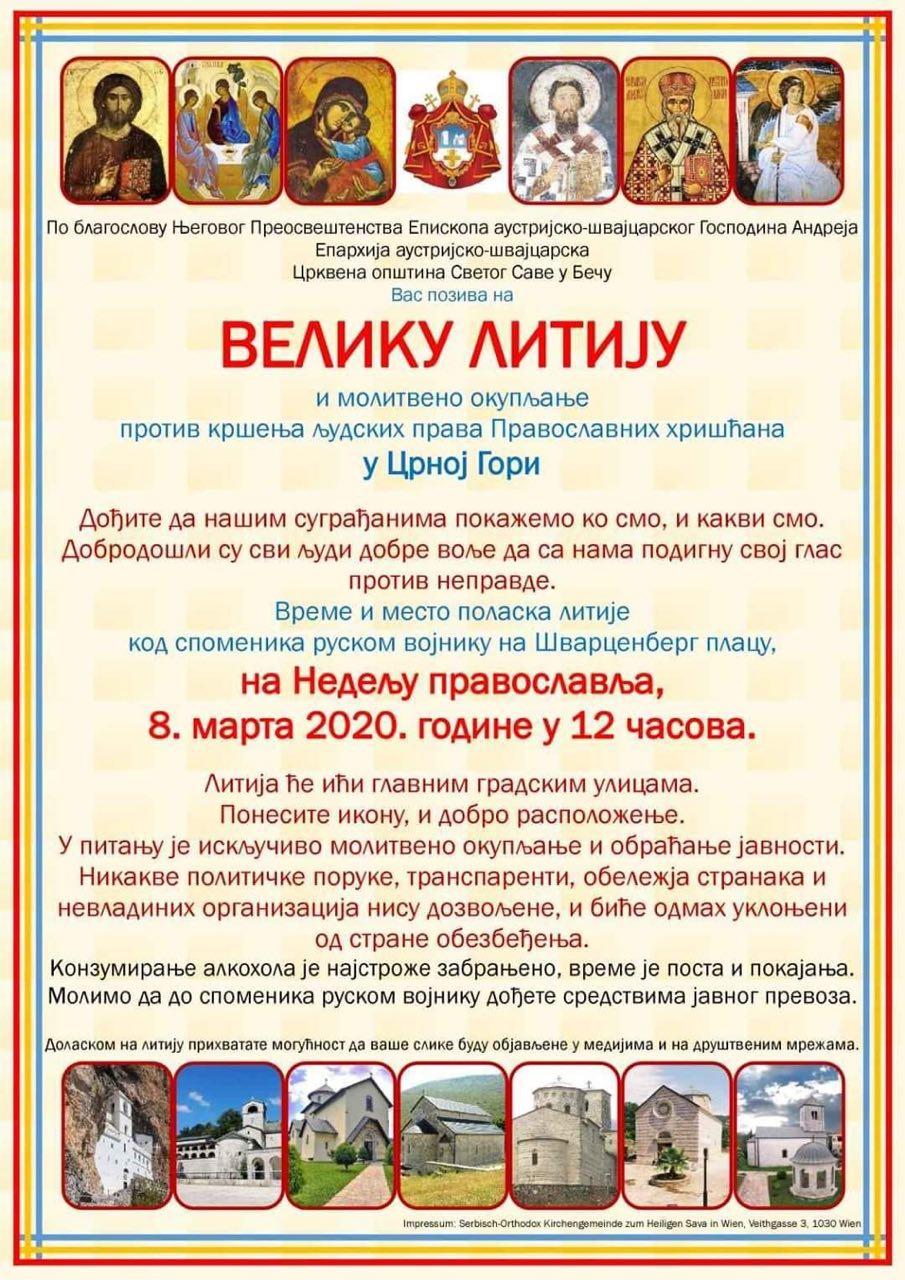 По благослову Његовог Преосвештенства Епископа аустријско-швајцарског г. Андреја, Епархија аустријско-швајцарска и Црквена општина Светог Саве у Бечу организује Велику литију и молитвено окупљање против кршења људских права Православних хришћана у Црној Гори.