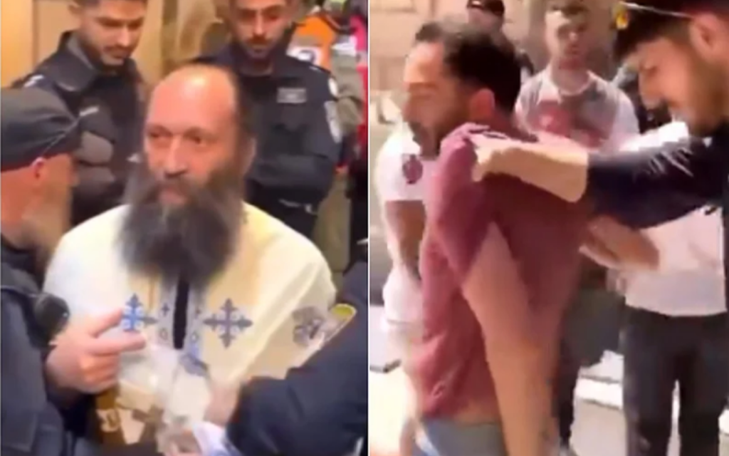 Israeli soldiers assaulting the Christian priests, pilgrims, worshippers, and local Christians in the holy sepulcher church, today in occupied Jerusalem during the “Holy Saturday” christian holiday. pic.twitter.com/yt4qStxlXI