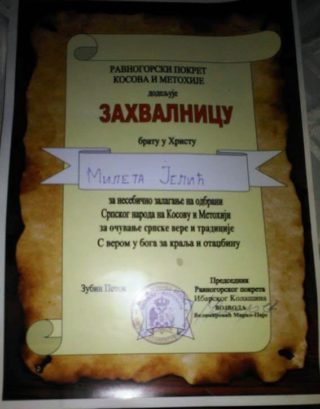 On je takođe pokazao i plaketu-zahvalnicu, koju je Velimirović darovao Jeliću, u ime Četničkog pokreta Ibarskog Kolašina.