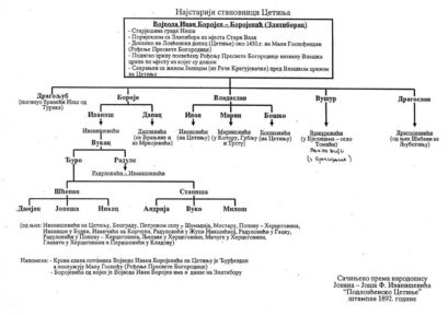Јован-Јошо Иванишевић даље пише да су од четворице синова војводе Ивана Боројева ( који је био Србин са Златибора,из мјеста које се као топоним назива Стари Влах- као и читава област која се простире од Златибора до ријеке Ибар) и жене му Јелице (која је била Српкиња из мјеста Рача код Крагујевца) настали потомци са презименима: Иванишевићи (на Цетињу,Београду,Петровом селу у Шумадији,Мостару и Попову у Херцеговини), Ивановићи(на Цетињу и у Бјелицама), Вушуровићи( на Цетињу и у Бјелицама), Драгославићи (од њих Шабани на Љуботињу), Дапчевићи (са Врањине и из Мркојевића), Бошковићи(са Цетиња) и Мариновићи ( у Грбљу, Котору и Трсту).