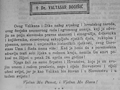 Посебно интересатно да у Хрватској систематски покушавају да прећуте српско порекло Валтазара Богишића. Називају га Балтазаром, то је посебно уочљиво на интернет страници Хрватског биографског лексикона.