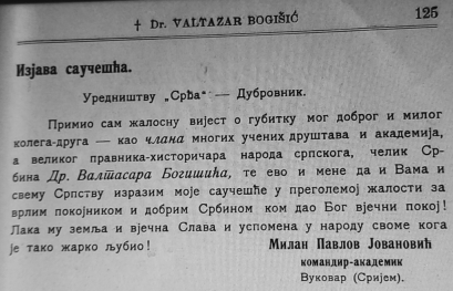 Милан Павлов Јовановић командир-академик из Вуковара упутио саучешће Уредништву „Срђа”. У саучешћу је истакнуто : „Примио сам жалосну вијест о губитку мог доброг и милог колега-друга – као члана многих учених друштава и академија, а великог правника-хисторичара народа српскога, челик Србина Др. Валтазара Богишића, те ево и мене да и Вама и свему Српству изразим моје саучешће у преголемој жалости за врлим и добрим Србином ком дао Бог вјечни покој ! Лака му земља и вјечна Слава у народу своме кога је тако жарко љубио !”